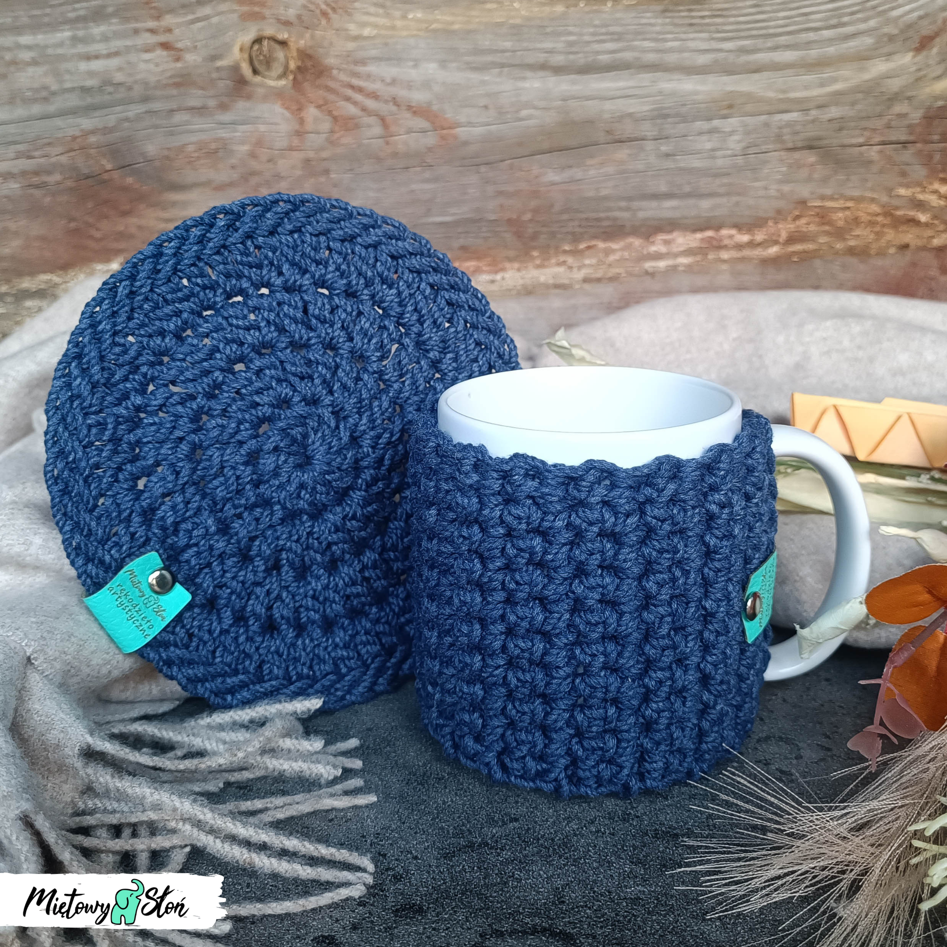 Komplet kubek w sweterku i podkładka ~ Miętowy Słoń.