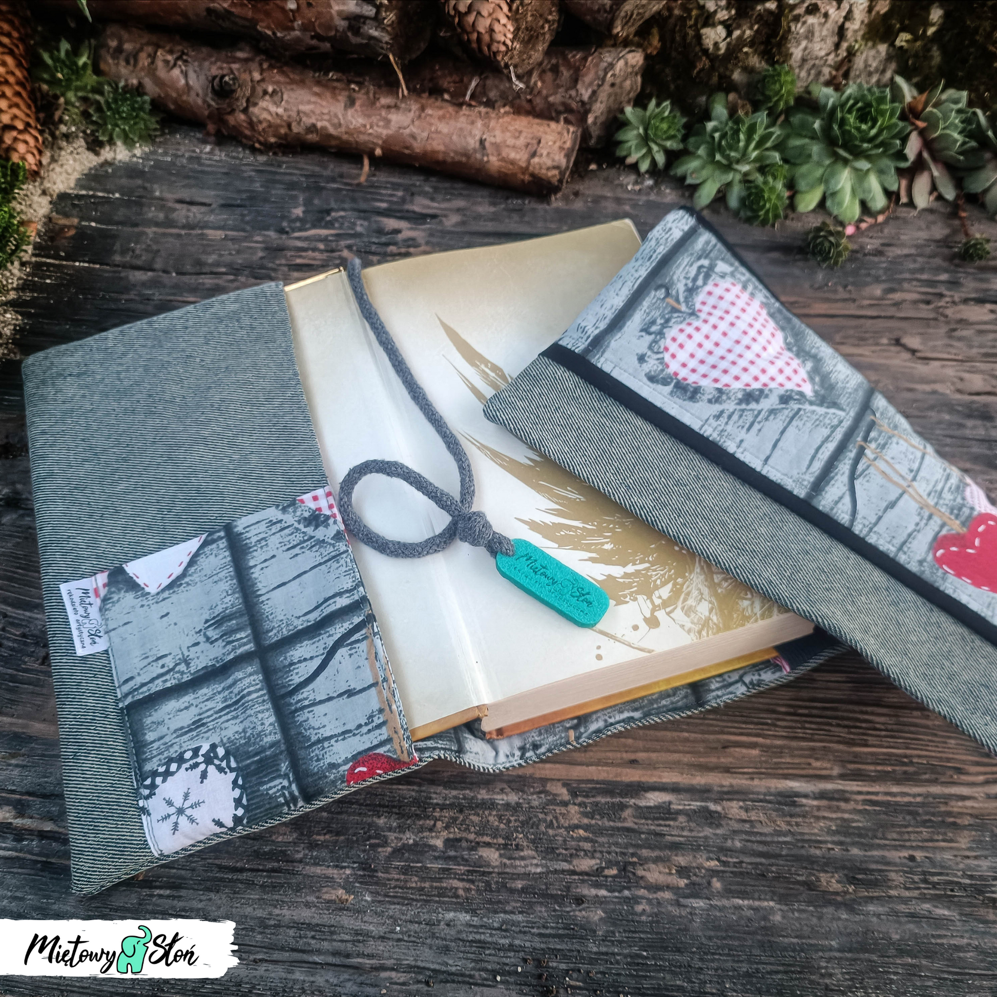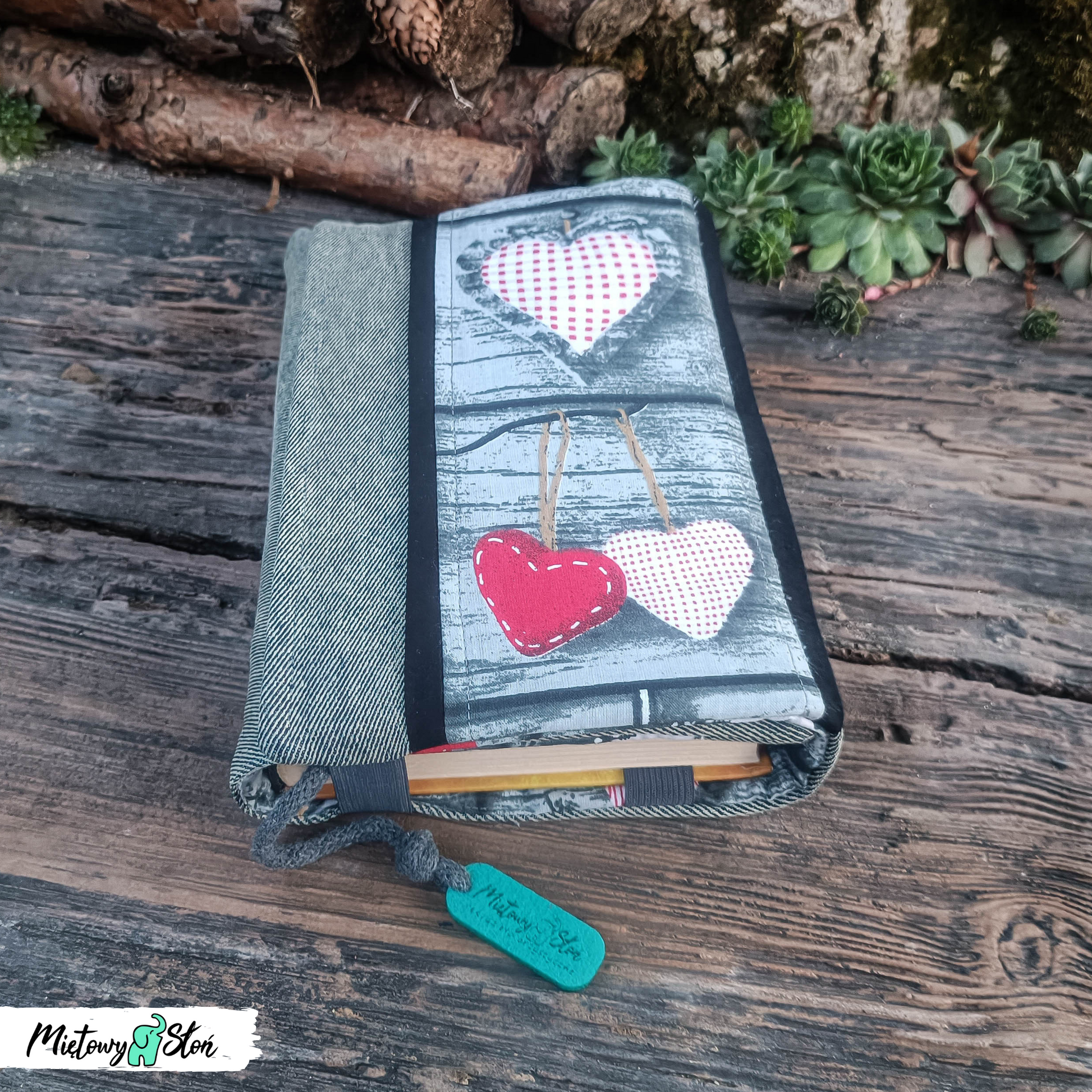 Otulacz / etui na książkę z tkaniny jeansowej - wzór SERCA.