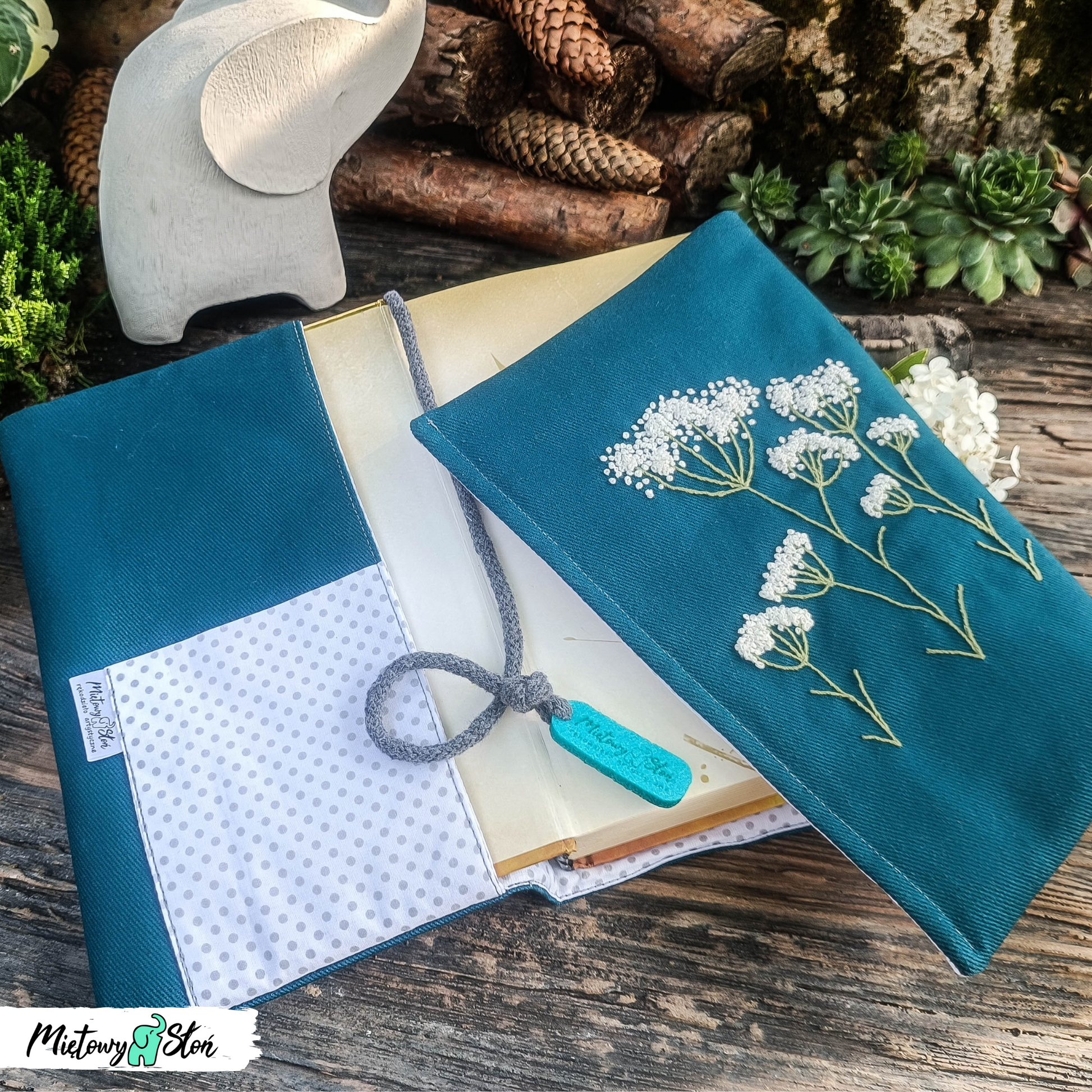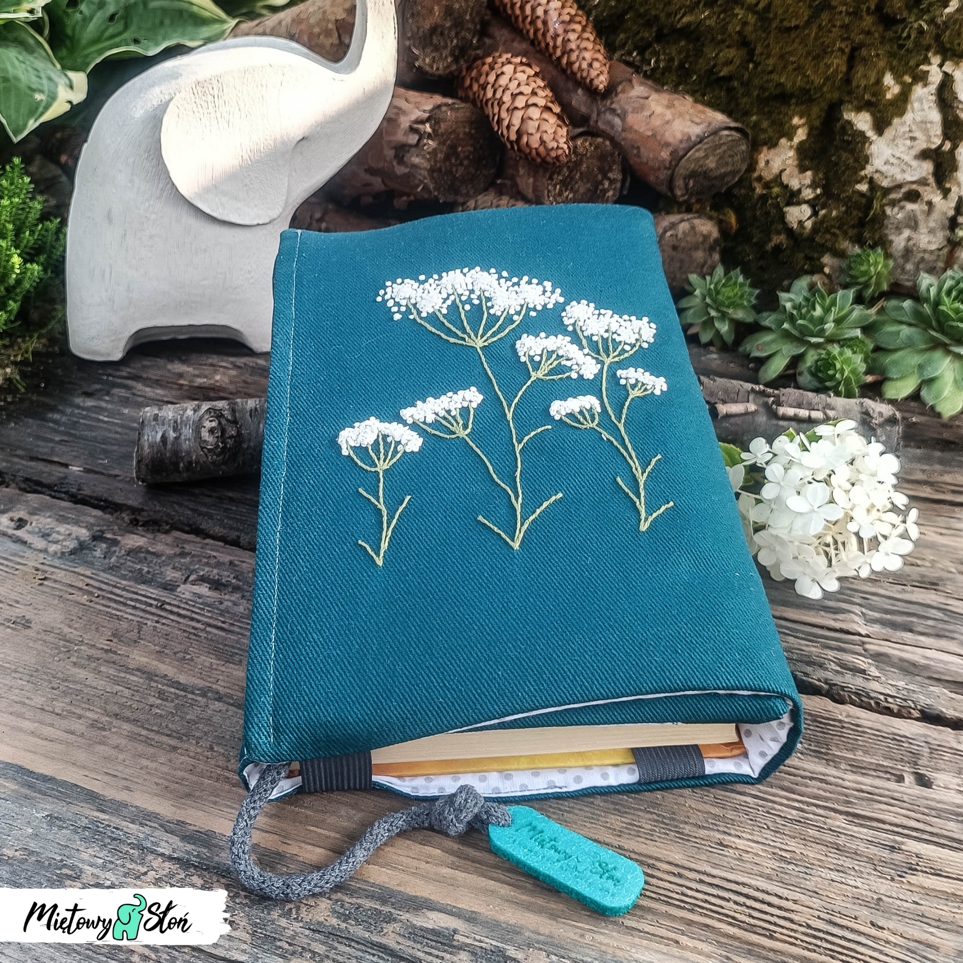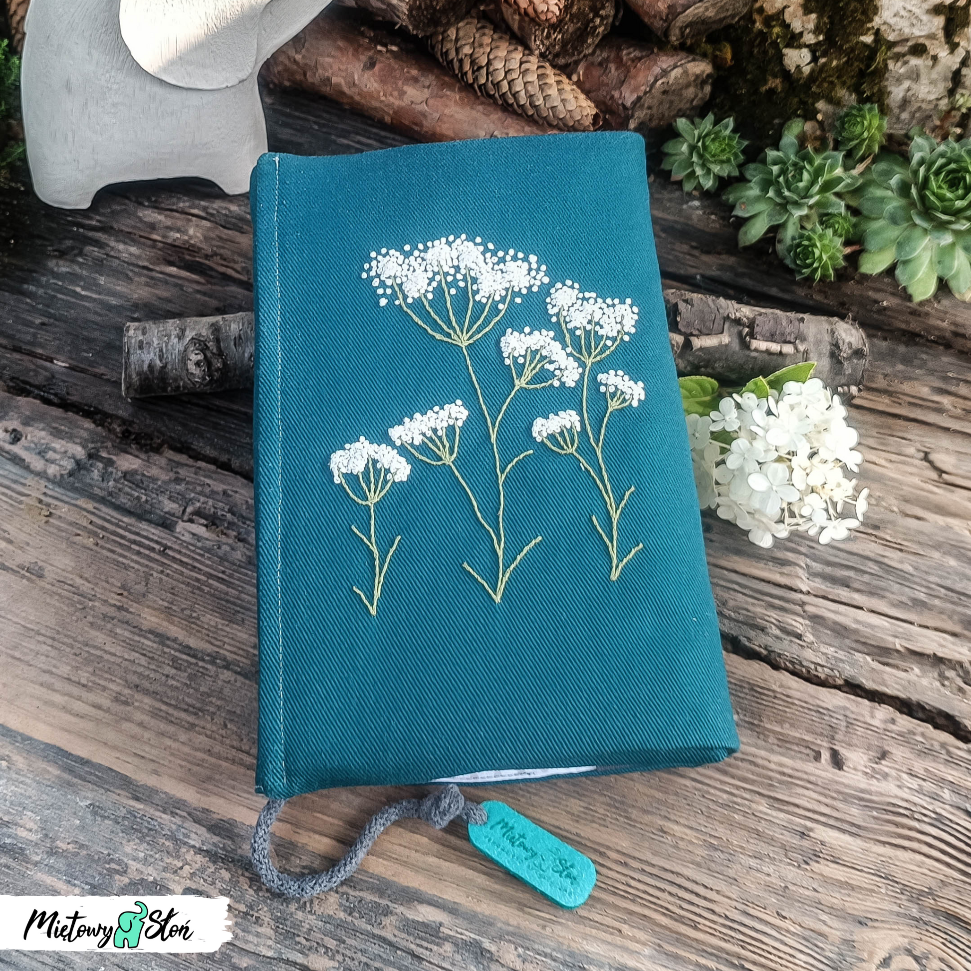Otulacz / etui na książkę z bawełny PANAMA w kolorze butelkowej zieleni z ręcznie haftowanym motywem kwiatów krwawnika.