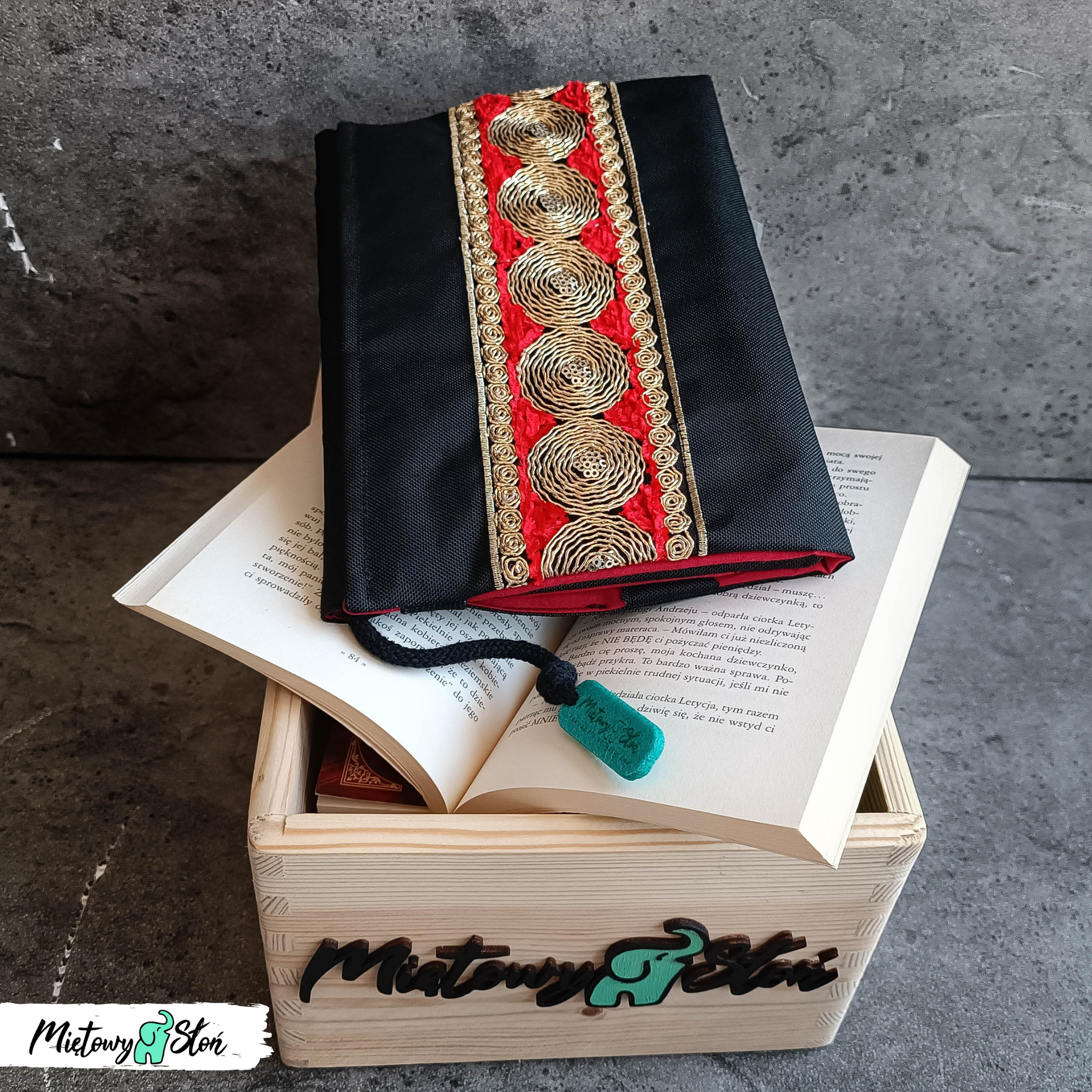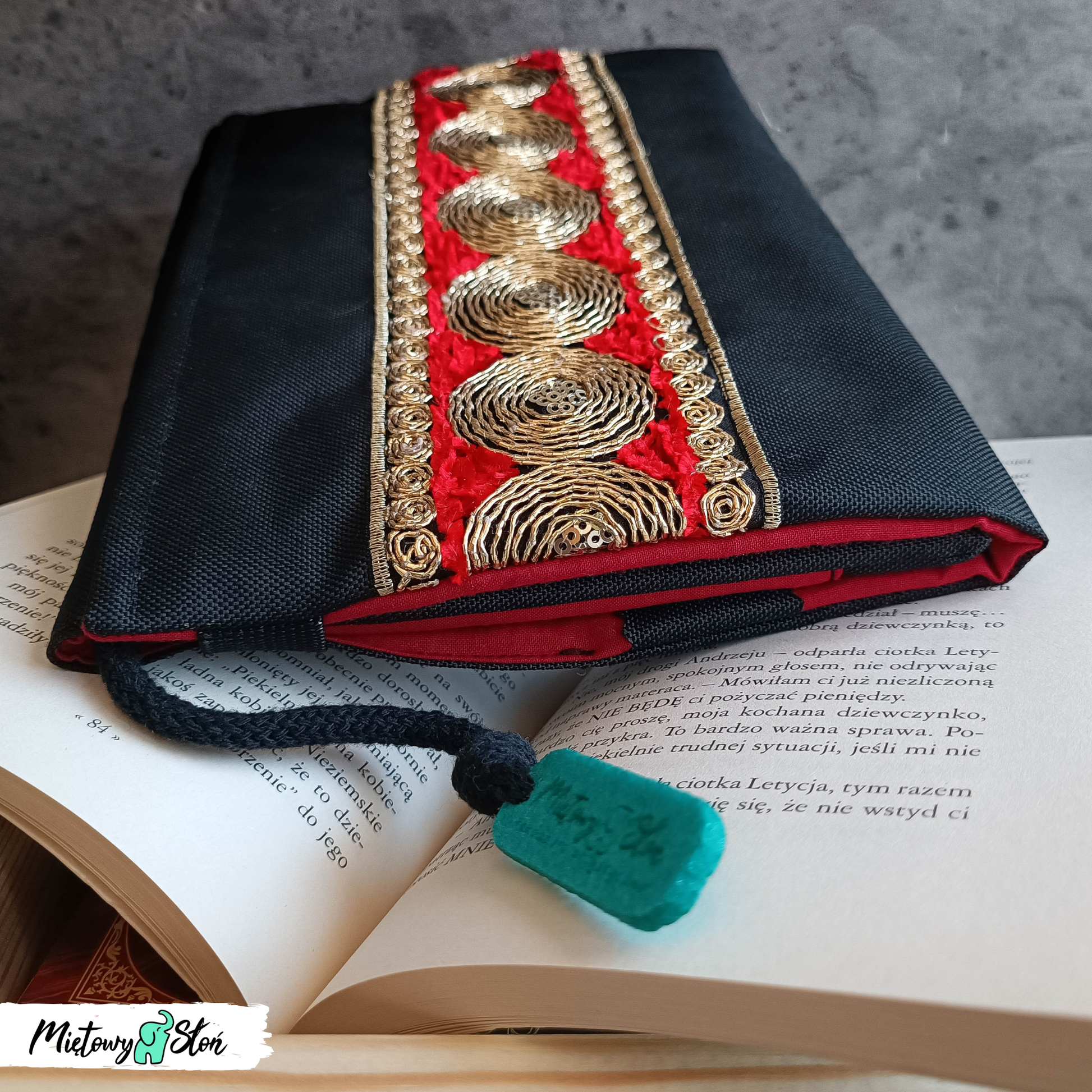 Otulacz / etui na książkę z czarnej tkaniny wodoodpornej z ozdobną haftowaną taśmą Zari.