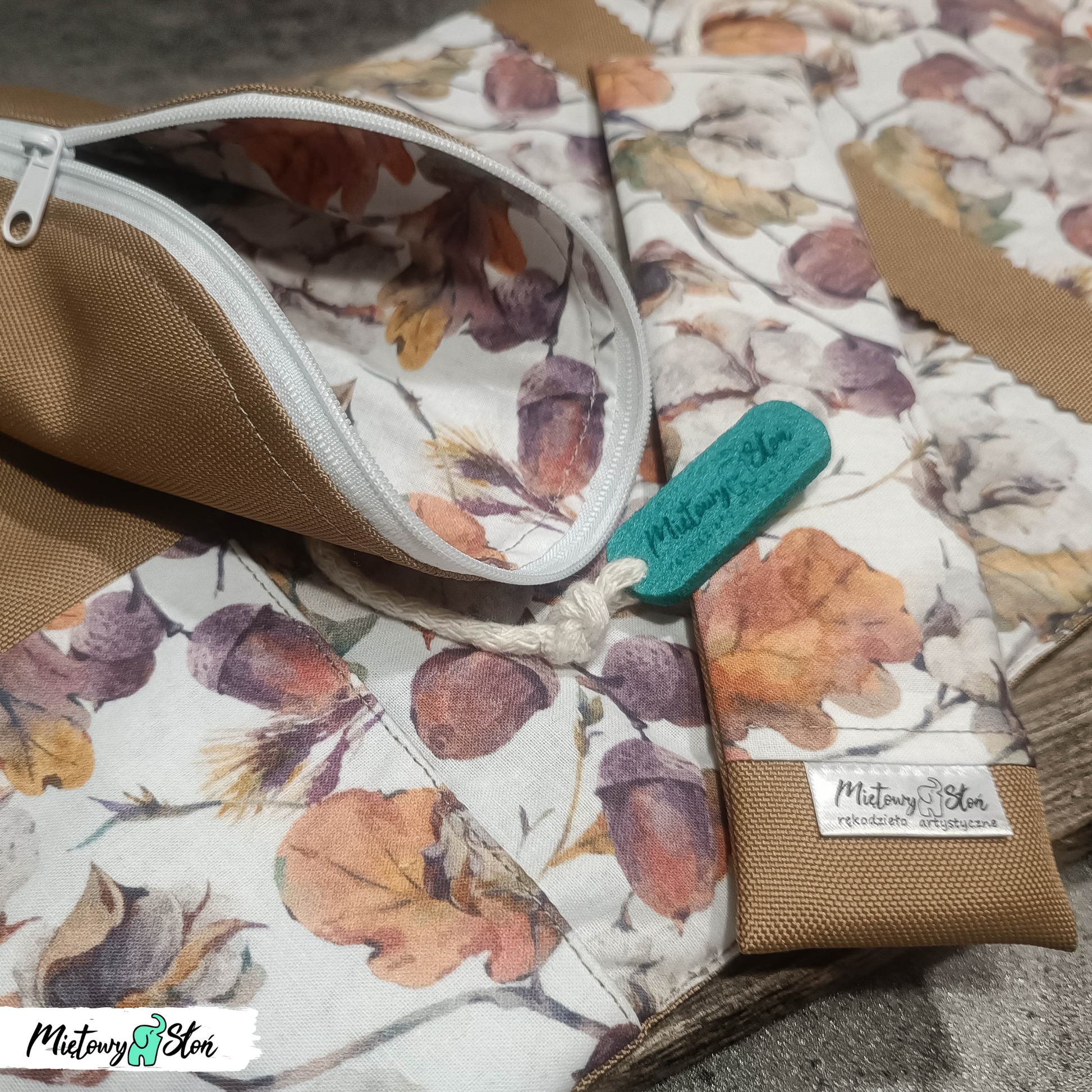 Piórnik piramidka z tkaniny wodoodpornej w kolorze karmelowym z bawełnianym środkiem w jesienne liście i żołędzie. Zapinany na suwak.