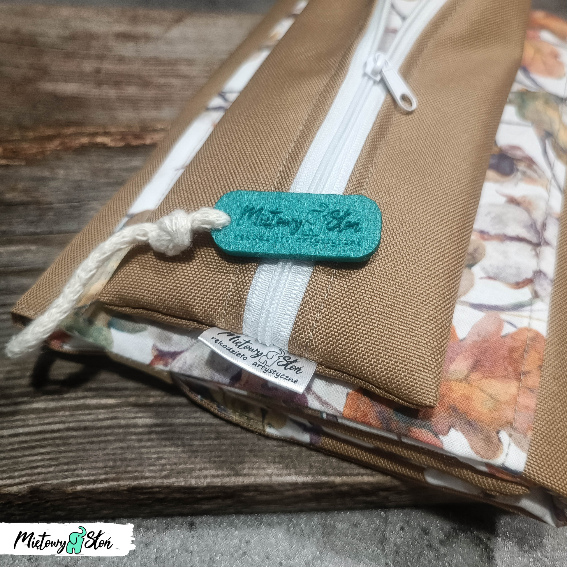 Otulacz / etui na książkę z tkaniny wodoodpornej w kolorze karmelowym z bawełnianą wstawką i środkiem w jesienne liście i żołędzie.